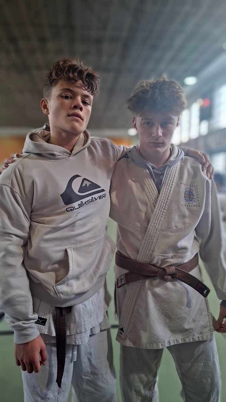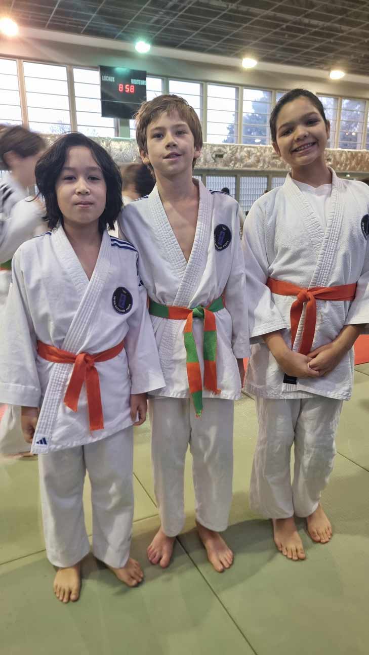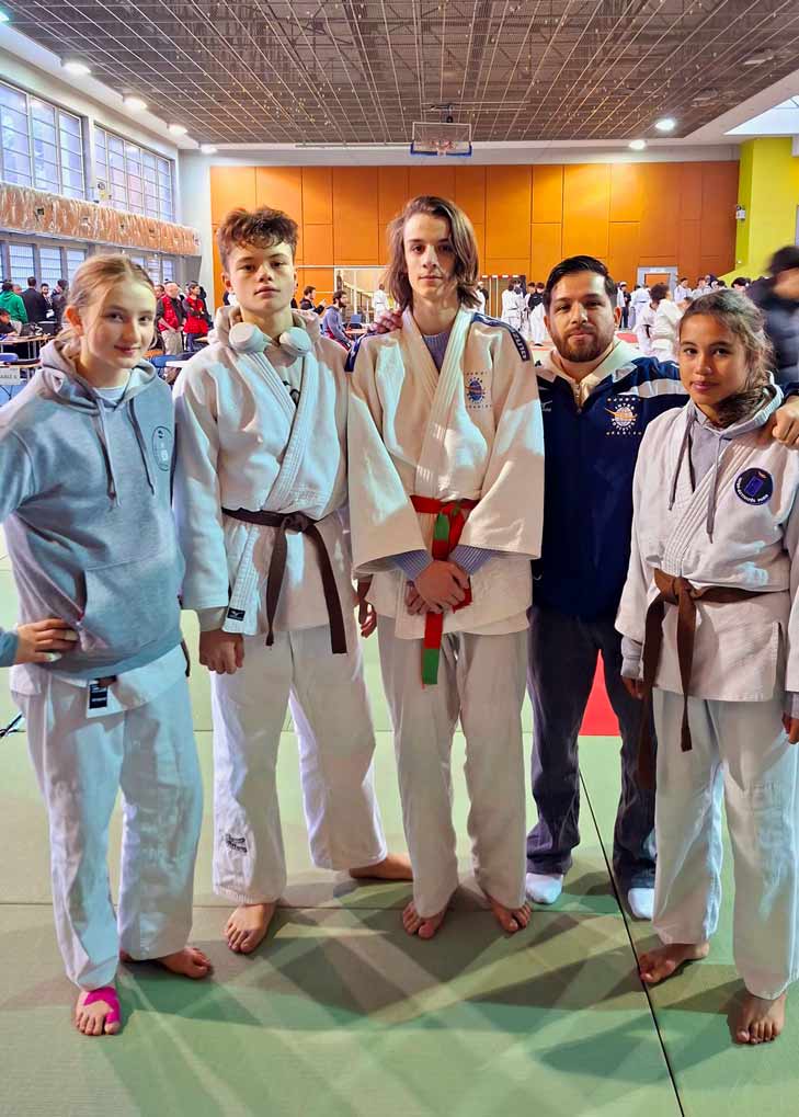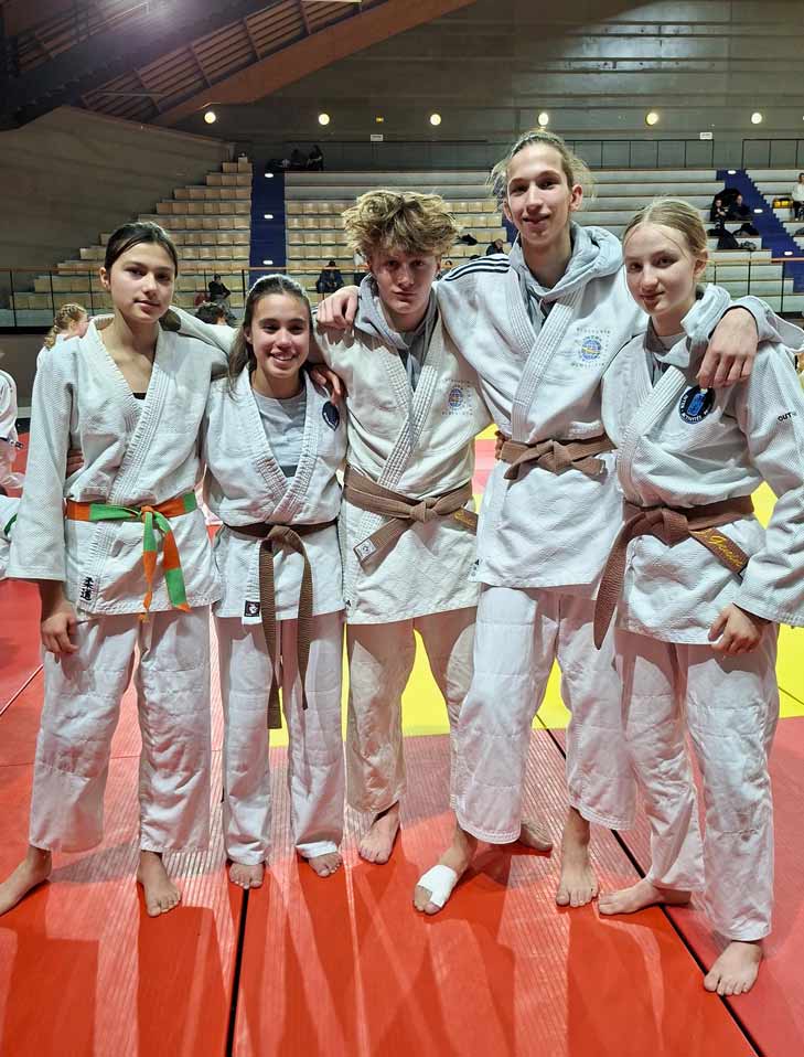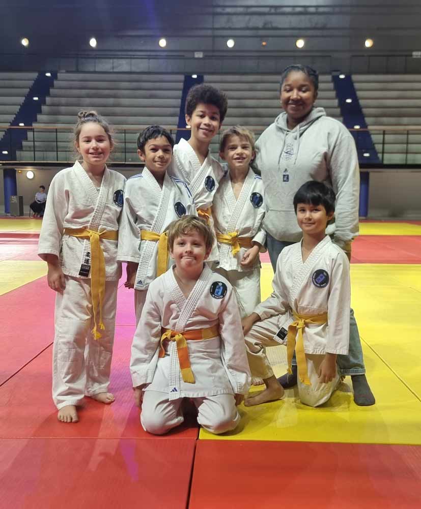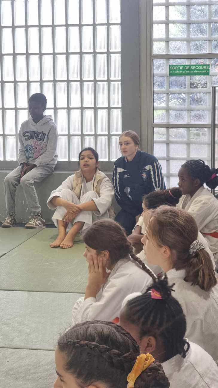 à l’Institut du judo, le 18 janvier 2026 Naomie et Julia (les cadettes du club) encouragent et suivent Théodore C., Sofia G.-R., Eusèbe B. et Thomas H.